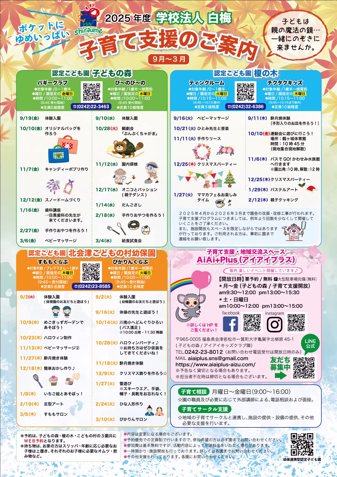 学校法人白梅では、「子どもの森」「榎の木」「北会津こどもの村幼保園」そして